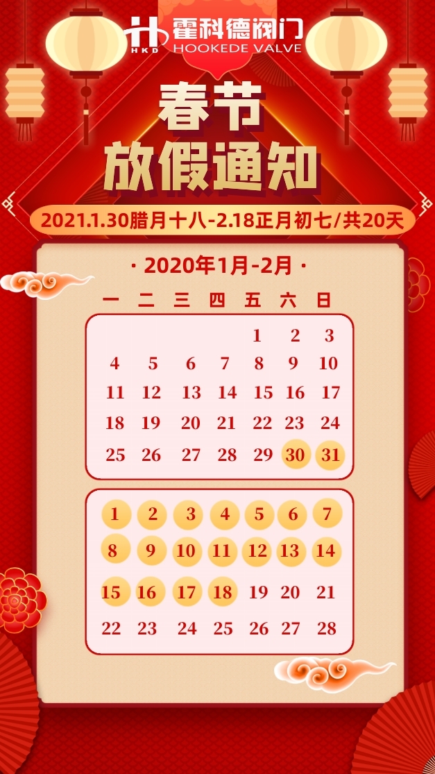 一年一度的農(nóng)歷春節(jié)已經(jīng)臨近,在此感謝你們一年來(lái)辛勤地工作和長(zhǎng)久的支持。因?yàn)橛心銈?,霍科德才?span style="font-size: 18px; white-space: normal;">砥礪前行和蒸蒸日上。在此,預(yù)祝全體同事新春愉快,萬(wàn)事大吉!預(yù)祝全體客戶們吉祥如意,平安喜樂!2021年春節(jié)公司安排放假時(shí)間如下: